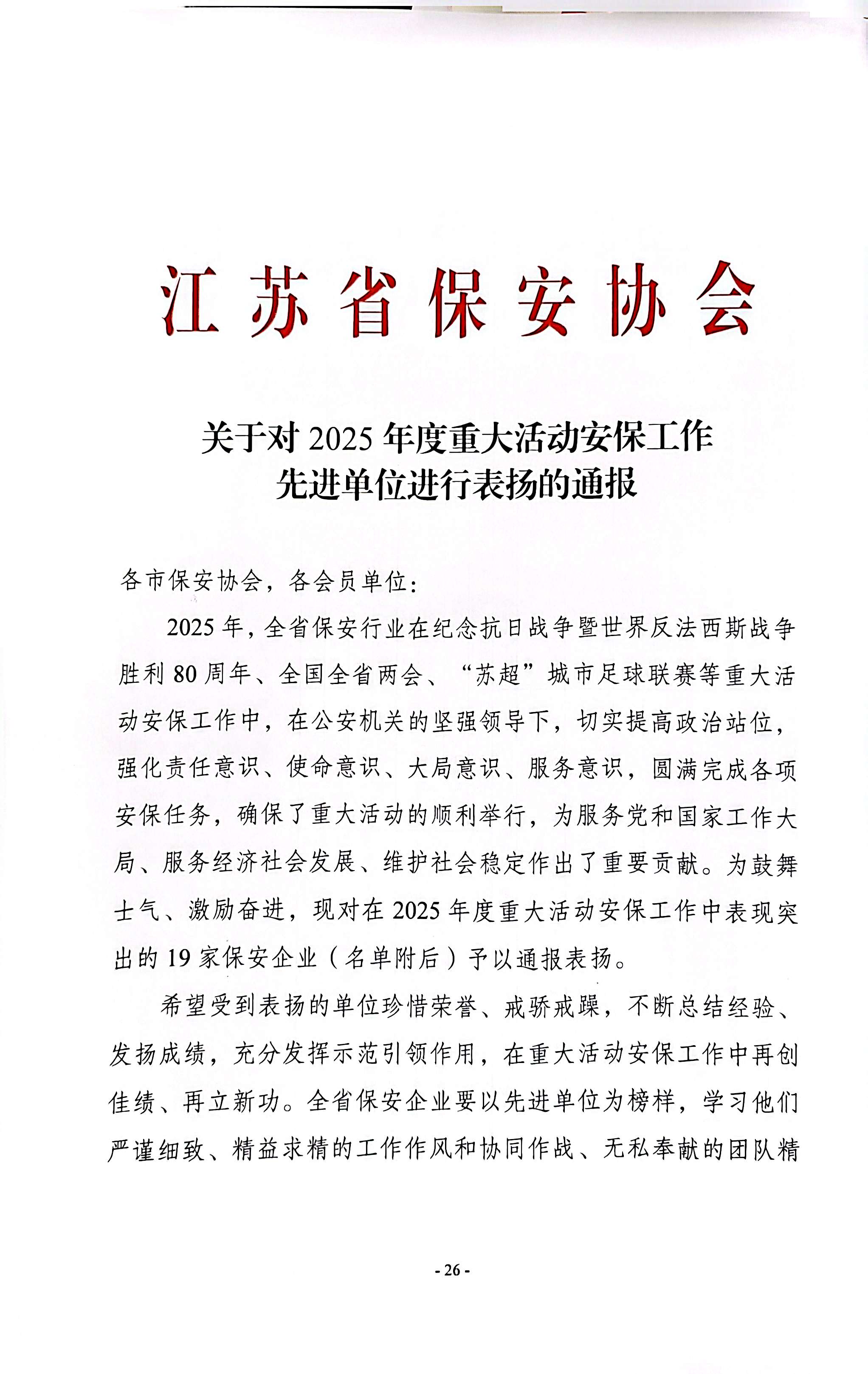 喜報!南京市保安服務(wù)有限公司榮獲“2025年度重大活動安保工作先進(jìn)單位”稱號